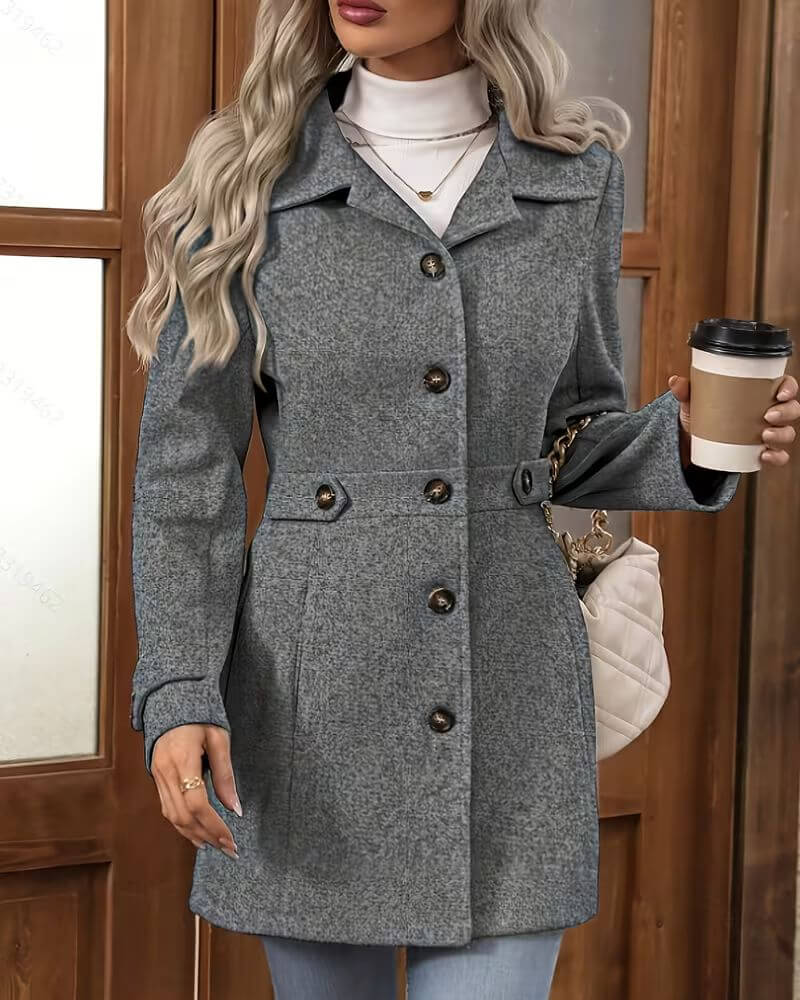 Αυτό το παλτό προσφέρει μια κομψή εμφάνιση με τη δομημένη σιλουέτα του και το καθαρό κουμπωτό μπροστινό μέρος. Σχεδιασμένο με καθορισμένη μέση και ραμμένη φινέτσα, μεταβαίνει ομαλά ανάμεσα σε casual και επίσημες εμφανίσεις.