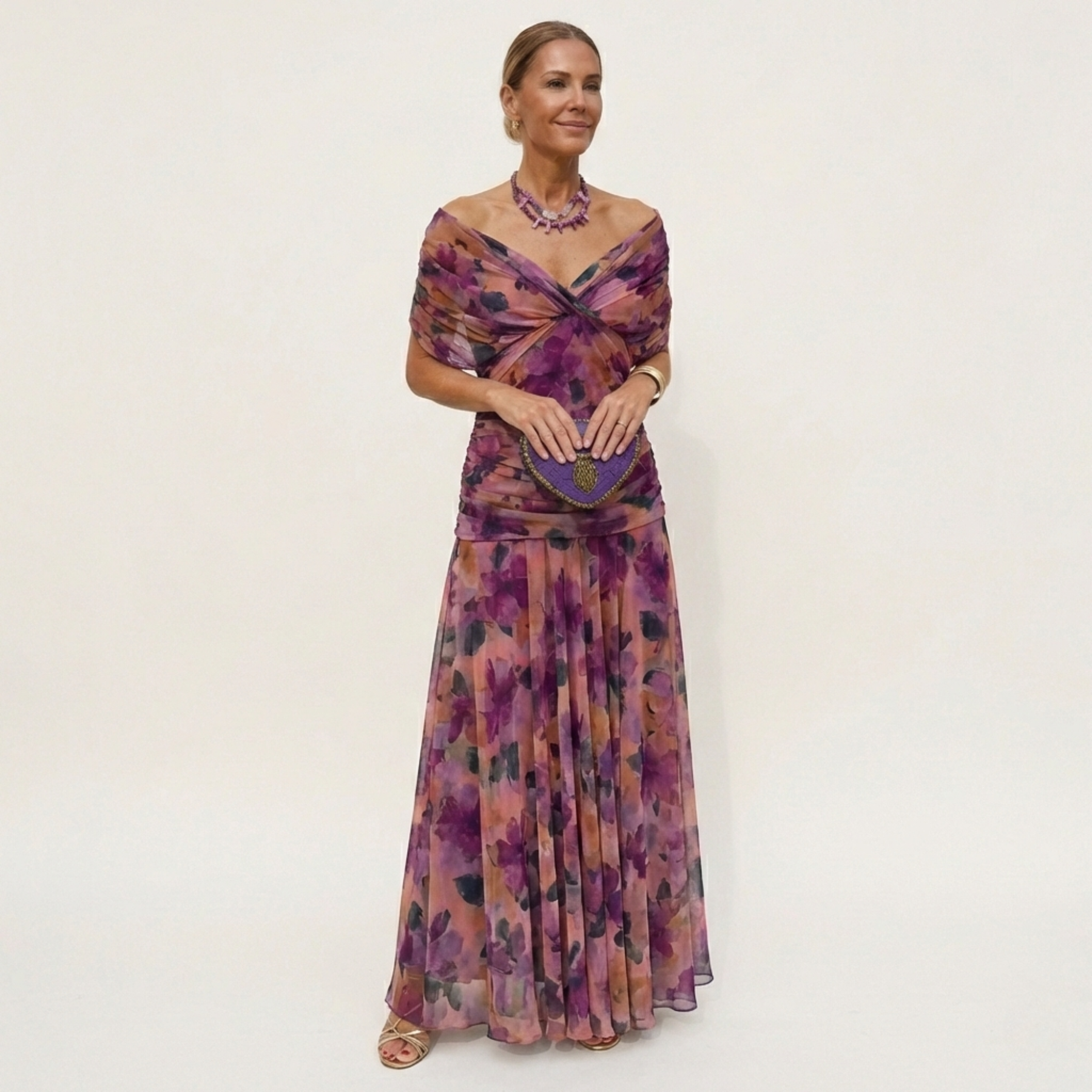 Αυτό το maxi φόρεμα σχηματίζει αβίαστα μια κολακευτική σιλουέτα, με αέρινη κίνηση και ισορροπημένη δομή. Ο πτυχωτός λαιμός σε V και η τονισμένη μέση αγκαλιάζουν απαλά το σώμα, προσφέροντας μια καλοραμμένη εικόνα ιδανική για δεξιώσεις, γιορτές και βραδινές εμφανίσεις. Το υλικό με απαλό άγγιγμα ακολουθεί κάθε σας κίνηση, χαρίζοντας άνεση και διακριτική λάμψη.